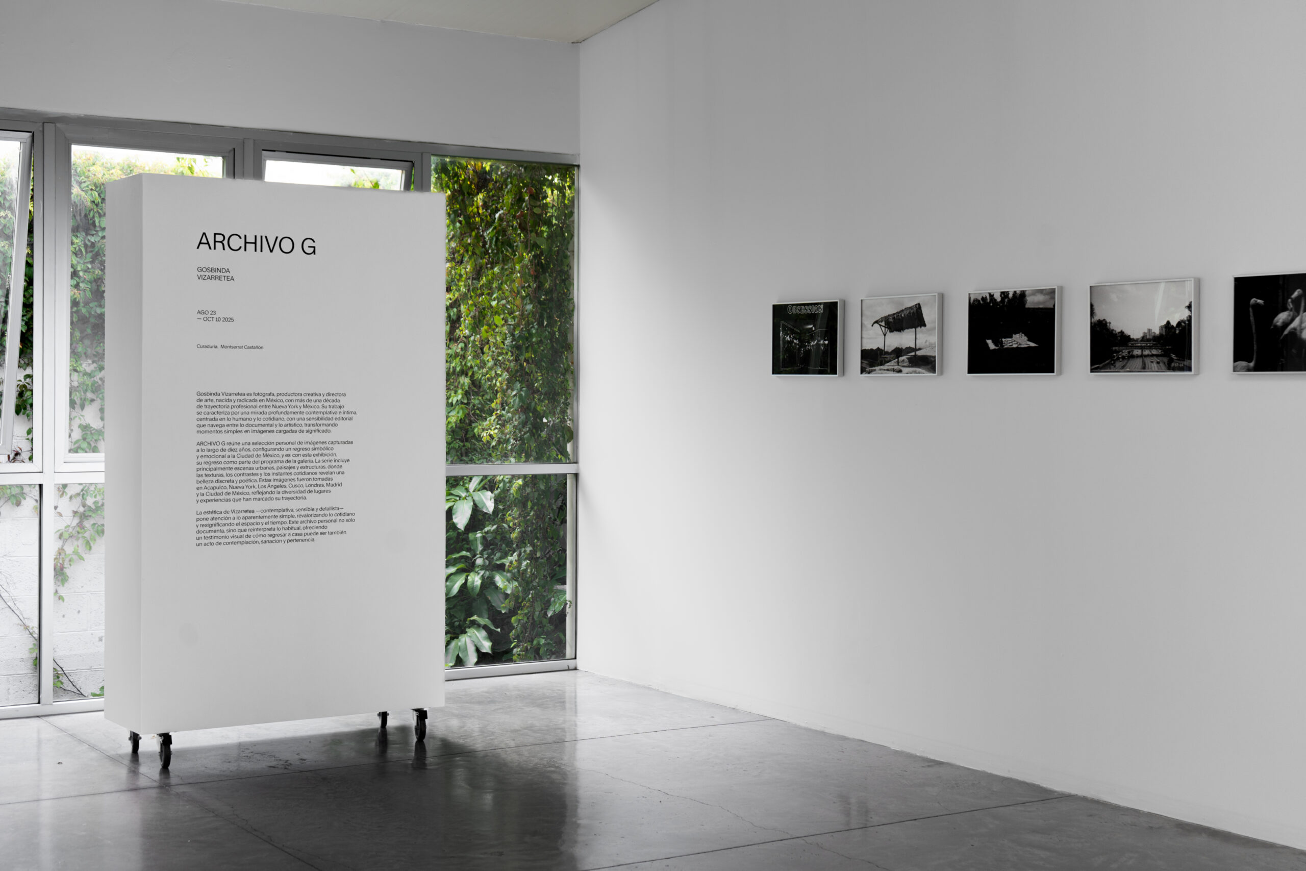ARCHIVO G reúne una selección personal de imágenes capturadas a lo largo de diez años, configurando un regreso simbólico y emocional a la Ciudad de México, y en con esta exhibición, su regreso como parte del programa de la galería. La serie incluye principalmente escenas urbanas, paisajes y estructuras, donde las texturas, los contrastes y los instantes cotidianos revelan una belleza discreta y poética. Estas imágenes fueron tomadas en Acapulco, Nueva York, Los Ángeles, Cusco, Londres, Madrid y la Ciudad de México, reflejando la diversidad de lugares y experiencias que han marcado su trayectoria.